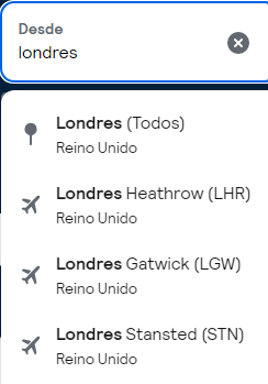 De la misma manera, si escribes el nombre de una ciudad sin aeropuerto, Skyscanner te propondrá una lista de los aeropuertos más cercanos al lugar.