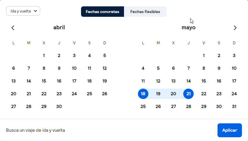 En la parte de arriba se puede alternar entre fechas concretas y fechas flexibles. En esta guía nos vamos a quedar en fechas concretas. Clica una vez para escoger la fecha de la ida y clica una segunda vez para escoger la fecha de la vuelta.