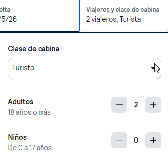 Este campo es bastante simple. Primero seleccionamos la clase de cabina parar la que queremos buscar opciones, como turista o business. Estas opciones variarán dependiendo del trayecto.