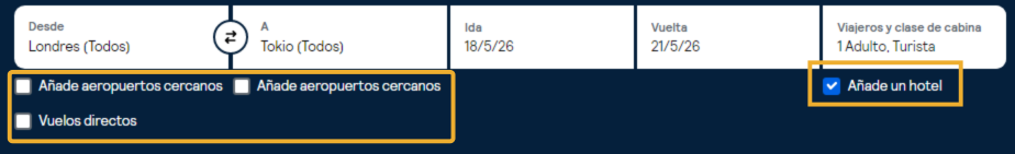 Las fechas seleccionadas indican el día del inicio del trayecto, no de la llegada a destino. En viajes cortos esto no tiene importancia, pero en viajes muy largos la puede tener. Un ejemplo: Supongamos que buscamos un viaje de ida y vuelta de Londres a Tokio y seleccionamos la ida el 18 de mayo y la vuelta el 21 de mayo. Skyscanner nos mostraría lo siguiente: