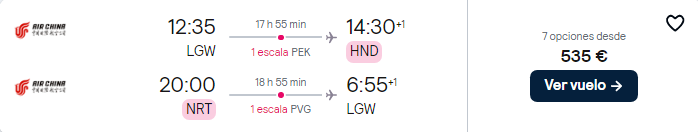 - Horarios: la línea de arriba indica el horario del viaje de ida y la línea de abajo el horario del viaje de vuelta. Las horas son siempre horas locales: en este ejemplo, 12:35 es la hora de salida en Londres y 14:30 es la hora de llegada en Tokio. El +1 indica que la llegada a destino es un día más tarde que la salida.