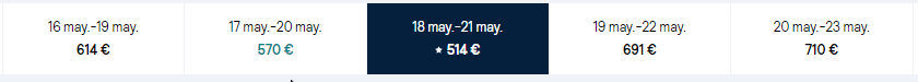 En la parte de arriba encontraremos una banda con distintas fechas y precios. Esta banda nos permite mover nuestro viaje un día arriba o un día abajo, manteniendo la duración original del viaje. El precio que aparece es el precio más bajo disponible para las fechas indicadas. Si tienes un mínimo de flexibilidad, es una herramienta muy útil para ahorrar sin volverse loco buscando.