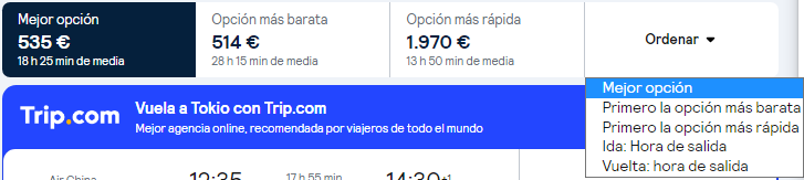 Skyscanner nos permite ordenar los resultados según distintos criterios. Por defecto, estarán ordenados según Mejor opción, que es una combinación que hace la web automáticamente entre precio, duración y número de escalas.