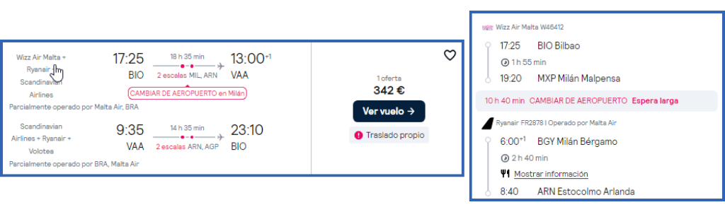 Dos elementos muy a tener en cuenta durante las escalas son el traslado propio y el cambio de aeropuerto. Skyscanner rastrea todas las opciones posibles y muy a menudo propone soluciones creativas que combinan distintas aerolíneas o te hacen cambiar de aeropuerto en una misma ciudad.